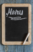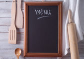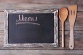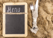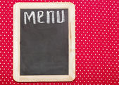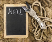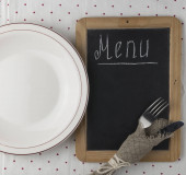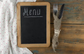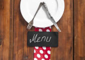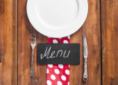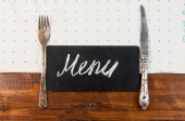 Nazwa menu napisana biała kreda na tablicy z nożem do nakrywania stołu i widelcem leżącym na obrusowej kropce polki. Skopiuj miejsce na tekst.