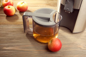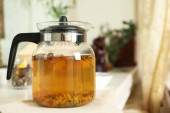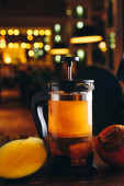 herbata z gruszki i róży biodra w prasie francuskiej na stole w restauracji