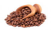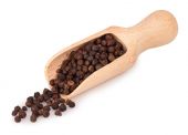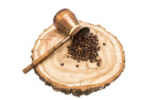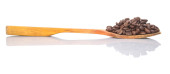 Ziarna pieprzu gwinejskiego w drewnianej gałce, izolowane na białym tle. Melegeta, papryka aligatora lub mahlab. Ziarna raju