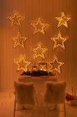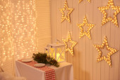Jadalnia urządzona na Boże Narodzenie. Stół z krzesłami, czeka na gości. Ściana ozdobiona jest jasnymi gwiazdami, wnętrze domu Bożego Narodzenia. Piękny Nowy Rok urządzone klasyczne wnętrze domu, zima