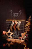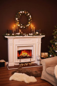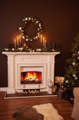 Boże Narodzenie Kominek i Choinka, Prezenty Prezenty Dekoracje, Nowy Rok Wnętrze domu Tło. Tradycyjny kominek z dużą ilością świec. Oświetlenie kominka, zdjęcie pionowe