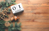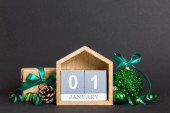 Nowy Rok wystrój i kalendarz na stole na ciemnym tle