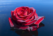 Czerwona róza z odbiciem na tle błękitnego nieba. Piękno w przyrodzie, Piękny kwiat w słoneczny dzień