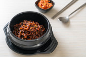 Koreański czarny spaghetti lub instant makaron z pieczonym sosem sojowym chajung (chapagetti) - koreański styl żywności