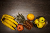 jabłka, jeden ananas, grejpfrut, granat i świeża paczka bananów. Widok z góry. czarny drewniany stół tła.puste miejsce do kopiowania. wiersz zdrowa żywność