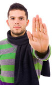 Zdjęcie "Przystanek co młody człowiek z jego strony, na białym tle" może być wykorzystywane do celów osobistych i komercyjnych zgodnie z warunkami zakupionej licencji Royalty-free. Obraz jest dostępny do pobrania w jakości wysokiej rozdzielczości do 5760x3840.