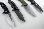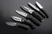 Zdjęcie "Składanie noży na drewnianym tle. Noże do wstrzykiwaczy na ciemnobrązowym tle." może być wykorzystywane do celów osobistych i komercyjnych zgodnie z warunkami zakupionej licencji Royalty-free. Obraz jest dostępny do pobrania w jakości wysokiej rozdzielczości do 5760x3840.