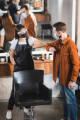 fryzjer w tarczy twarzy w pobliżu kobiety przy użyciu tabletki cyfrowej, rozmyty pierwszy plan