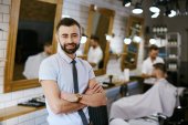 uśmiechnięty fryzjer w fartuchu trzymający nożyczki stojąc w miejscu pracy na rozmytym tle