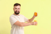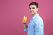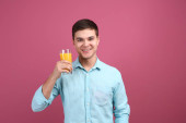Przystojny mężczyzna z sokiem pomarańczowym na tle koloru