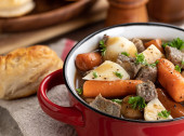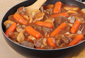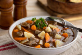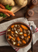 Zbliżenie miski zupy z wołowiny warzywnej z marchewką i ziemniakami