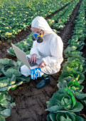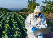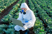 Agronomist rozpylanie pestycydów na polu ze zbiorami.