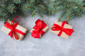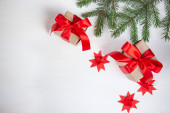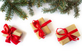Kompozycja noworoczna. Gałęzie jodłowe, opakowania z upominkami ozdobione czerwonymi kokardkami na jasnym tle. Koncepcja świąt. Płaskie łóżko, widok z góry. Sztandar.