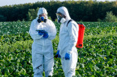 Agronomist rozpylanie pestycydów na polu ze zbiorami.