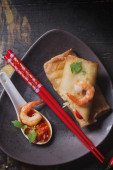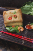 Tradycyjny tajski makaron. Smażony makaron Pad tajski z krewetkami i kurczakiem w misach kokosowych ze świeżą limonką, chili nad liściem banana na rustykalnym drewnianym krześle. Widok z boku. Skupienie selektywne