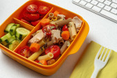 Zdrowa żywność w plastikowych pojemnikach gotowa do spożycia z domowym spaghetti z pomidorem, serem i bazylią na stole roboczym. Włoskie jedzenie. Zabrać..