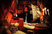 Portret strasznej wiedźmy w drewnianym domu w zielonym dymie. Magia, ciemna siła, zaklęcie.