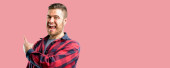Młody dorosły mężczyzna z długimi włosami noszący luźną koszulę, gestykulujący dłońmi pokazującymi duży i duży znak rozmiaru, symbol miary. Uśmiechnięty patrząc w kamerę. koncepcja pomiaru.