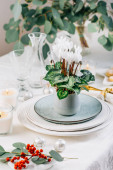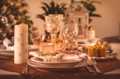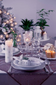 Nakrycie stołu na święta Bożego Narodzenia i Nowy Rok. Świąteczny stół w domu z choinką.