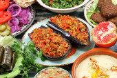 falafel Bliski Wschód, arabski lub śródziemnomorski stół w tle