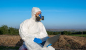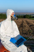 Naukowiec noszący biały sprzęt ochronny, maskę chemiczną i okulary używa laptopa na roli.