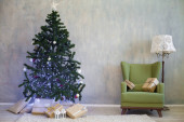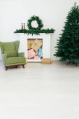 Choinka z prezentami przy kominku na nowy rok wystrój domu