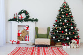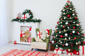 Choinka z prezentami przy kominku na nowy rok wystrój