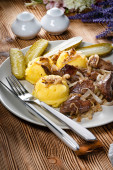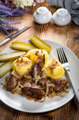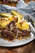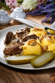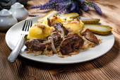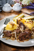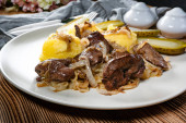 Smażona wątróbka z cebulą, podawana z ziemniakami puree i ogórkiem marynowanym.