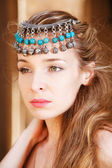 Piękny portret pięknej panny młodej w słoneczny dzień na niebie.