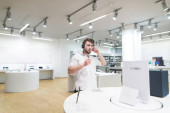 Sprzedawca człowiek telefon komórkowy profesjonalny konsultant w sklepie lub sklepie sprawdzić nowe inteligentne zegarki.