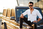 Południowo-azjatycki mężczyzna lub indyjski mężczyzna myje swój biały transport na myjni samochodowej.