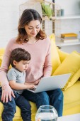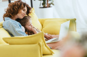 kobieta gospodarstwa w ramionach niemowlę syn podczas karmienia piersią w pobliżu laptopa podczas siedzenia na kanapie