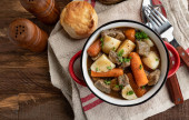 Gulasz wołowy z marchewką i ziemniakami w drewnianej misce i herbatnikach. Widok nad głową