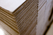 Produkty i tektura falista. Fabryka do produkcji i przetwarzania papieru. Prześcieradła, stosy. Wybiórcze skupienie. Pojemność i opakowanie. zapasy
