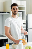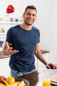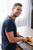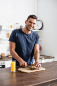Wesoły człowiek trzyma szklankę soku pomarańczowego w pobliżu kiwi na desce do krojenia na stole