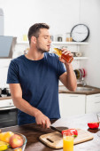 Uśmiechnięty mężczyzna rozmawiający na smartfonie trzymając szklankę soku pomarańczowego przy stole kuchennym na niewyraźnym pierwszym planie