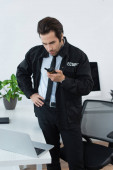 Zły biznesmen patrząc w kamerę pozbywając się smartfona w miejscu pracy
