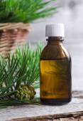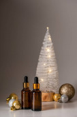 Mała butelka olejku eterycznego i gałązek jodłowych. Boże Narodzenie lub prezent walentynkowy. Koncepcja aromaterapii i spa.