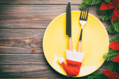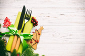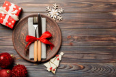 Widok z góry świąteczne dekoracje na drewnianym tle. Widelec i nóż na serwetce związane wstążką i puste miejsce do projektowania. Koncepcja nowego roku.