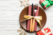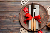 Zdjęcie "Widok z góry świąteczne dekoracje na drewnianym tle. Widelec i nóż na serwetce związane wstążką i puste miejsce do projektowania. Koncepcja nowego roku." może być wykorzystywane do celów osobistych i komercyjnych zgodnie z warunkami zakupionej licencji Royalty-free. Obraz jest dostępny do pobrania w jakości wysokiej rozdzielczości do 5760x3840.