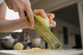 Bliskie zdjęcie dłoni dziewczyny, która łamie organiczne jajko, trzymając nóż nad miską ze stali nierdzewnej w kuchni..