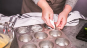 Zdjęcie ręki młodej kobiety, która zrzuca żółtko organicznego jajka do miski zupy ze stali nierdzewnej w kuchni.