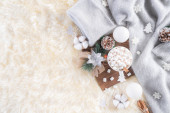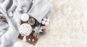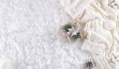 Zimowe przytulne tło z filiżanką kawy, ciepły sweter, pudełko z prezentami, bawełniany kwiat i świąteczna kulka na wełnianym tle dywanu, widok z góry z miejsca na ksero.
