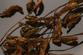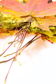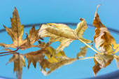 Upadły klon suche liście na powierzchni lustra, odzwierciedlone w nim, jesień martwa natura