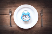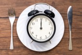 Górny widok budzik na białej płycie na drewnianym tle stołu. Przerywany post, dieta ketogenna, utrata masy ciała, plan posiłków i koncepcja zdrowej żywności