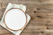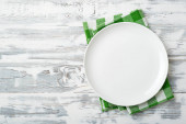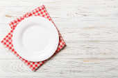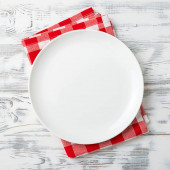 Pusty biały talerz i czerwona serwetka na białym drewnianym tle. Odbiór. Widok z góry