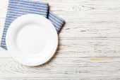 Pusty biały talerz i zielona serwetka na białym drewnianym tle. Odbiór. Widok z góry