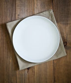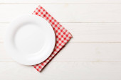 Pusty biały talerz i czerwona serwetka na białym drewnianym tle. Odbiór. Widok z góry