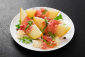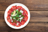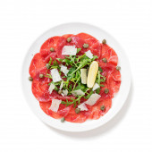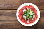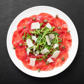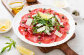 Wołowina Carpaccio zimna przystawka z parmezanem, kaparami i rukolą na białej płycie.Widok z góry.