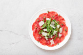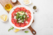 Wołowina Carpaccio zimna przystawka z parmezanem, kaparami i rukolą na białej płycie.Widok z góry.